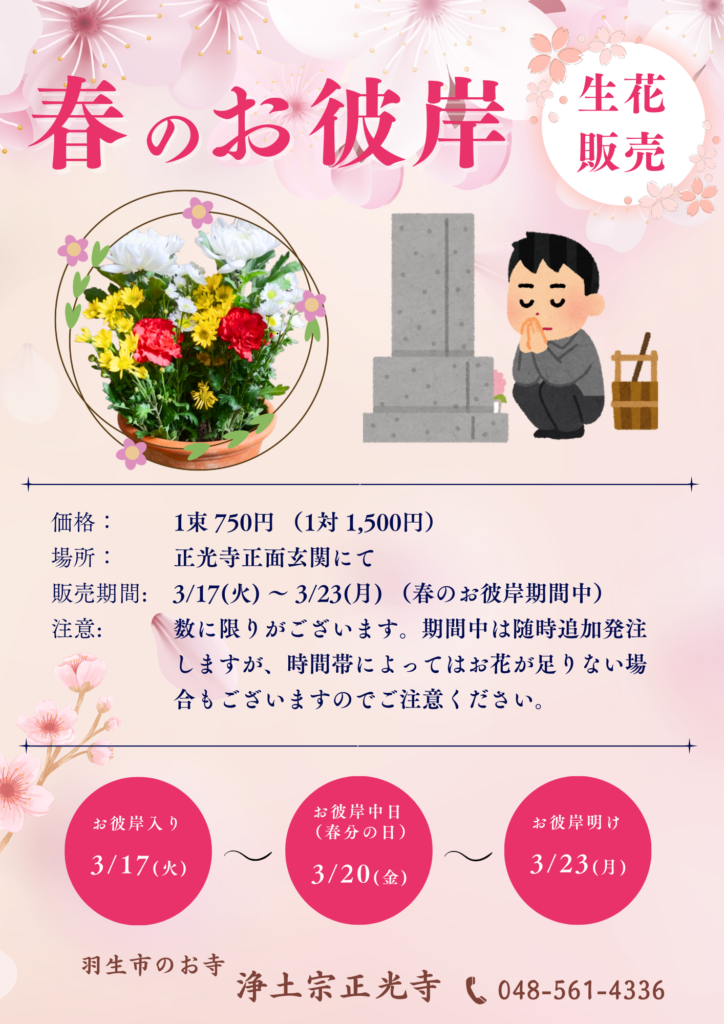 1. 行事の連絡 【2026年】春のお彼岸期間生花販売のお知らせ 2026.03.09 1. 行事の連絡 春のお彼岸期間中(3月17日~3月23日)、お墓・仏壇等にお供えできる生花を販売予定です。また、事前予約も受け付けておりますので、お気軽にお声がけください。詳細につきましては下記のチラシをご覧ください。(正光寺境内の掲示板等にも同じチラシを掲載しております) 春のお彼岸については、こちらもご覧ください。春の彼岸真西に沈む太陽と、ご先祖様達が居られる極楽浄土に思いを馳せる期間です。 Line お墓参りでの火の取扱いにご注意ください前の記事 新着のお知らせ お墓参りでの火の取扱いにご注意ください 2025.12.12 安産子育て身代わり地蔵尊の移転のお知らせ 2025.11.24 【2025年】秋のお彼岸期間生花販売のお知らせ 2025.09.14
